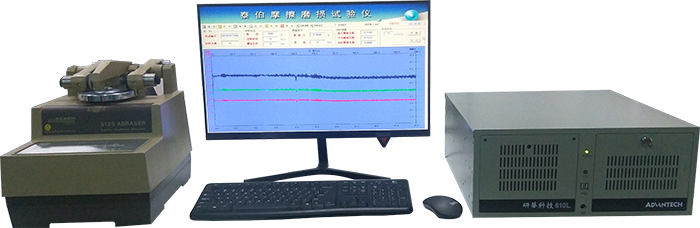 將待測材料放在轉(zhuǎn)盤上,兩個磨輪施加一定載荷,使其由轉(zhuǎn)盤帶動以一定速度做旋轉(zhuǎn)磨耗運動。試驗承受磨耗時,樣件表面材料受全角度顆;蚪z織狀物磨損形成一完整的圓環(huán)。磨輪隨樣件盤轉(zhuǎn)動面轉(zhuǎn)動,產(chǎn)生相對運動和磨耗,而轉(zhuǎn)動過程中磨輪軸相對于轉(zhuǎn)盤轉(zhuǎn)軸的偏移產(chǎn)生滑移運動,通過傳感器獲取摩擦時的扭矩信號,經(jīng)放大處理,輸入計算機經(jīng)A/D轉(zhuǎn)換將扭矩信號通過運算得到摩擦系數(shù)曲線。從而磨耗材料。
